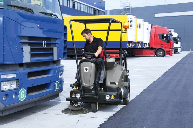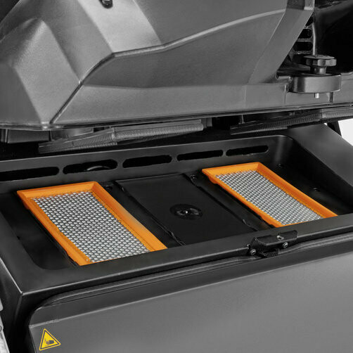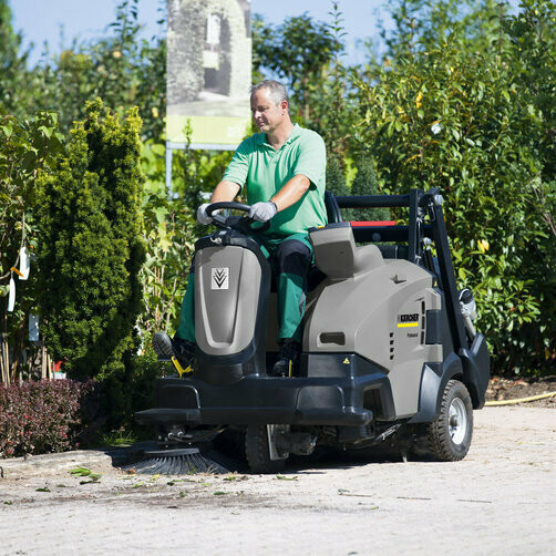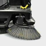 Balayeuse aspirante autoportée configurable, équipée d'un système de vidage en hauteur hydraulique. Les balais latéraux brevetés vous permettent de balayer un coin en une étape! La machine nettoie en un seul passage, contrairement à d'autres balayeuses qui auraient besoin de 5 ou même 7 passages. La position du balai principal, sur l'essieu arrière, fait en sorte que l'appareil puisse franchir des trottoirs élevés et d'autres obstacles, sans abîmer le système. Le système Teach prévoit le rattrapage automatique du balai principal en fonction de l'usure, afin de garantir un nettoyage constant et optimal. La balayeuse offre la choix entre trois sortes de pression sur le balai principal, dépendant des types de sol et de pollution. Une autre caractéristique importante est le décolmatage automatique du filtre: le système Tact breveté. Et n'oublions pas non plus le système Kärcher Intelligent Key breveté, qui prévoit l'attribution de droits d'utilisateur pour le paramétrage de la machine. Le panneau de contrôle dispose d'un menu clair en 19 langues différentes et procure l'utilisateur d'informations sur, entre autres, l'usure et la pression du balai principal.
