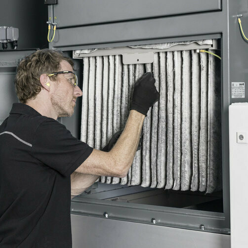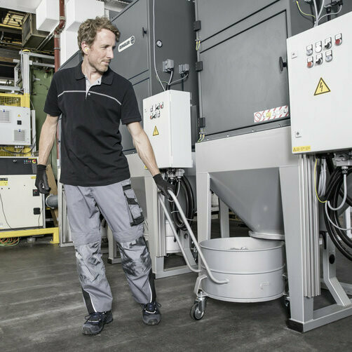 L'aspiration de grandes quantités de poussières et de copeaux fins à l'échelle industrielle constitue le domaine d'application principal de l'unité de dépoussiérage moyenne pression 350/110 Afc. À cet effet, elle dispose d'un filtre à poches de la classe de poussière M selon la norme DIN EN 60335-2-69 ainsi que d'une cuve mobile de 100 litres (DN 250) pourvue d'un regard et d'un sac à fond rond intégré, avec serre-flan et flexible de compensation de pression (DN 25) doté d'un raccord rapide. Pour réduire au minimum le niveau sonore, la partie motrice est entièrement insonorisée et équipée d'un canal de silencieux d'échappement en aval. Une armoire de commande selon la classe de protection IP 54 (conformément aux prescriptions allemandes VDE 0113) est également incluse en standard.